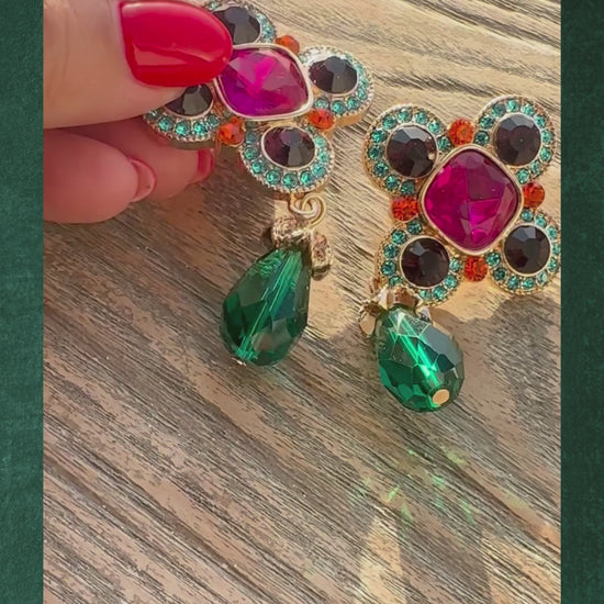 For the woman who commands rooms with a tilt of her head—these are not mere earrings, but petits chefs-d'oeuvre dripping from your lobes. Gilded in gold and alive with a carnival of rhinestones, each teardrop whispers of Versailles' stolen trinkets and Art Deco soirées where champagne flowed until dawn.