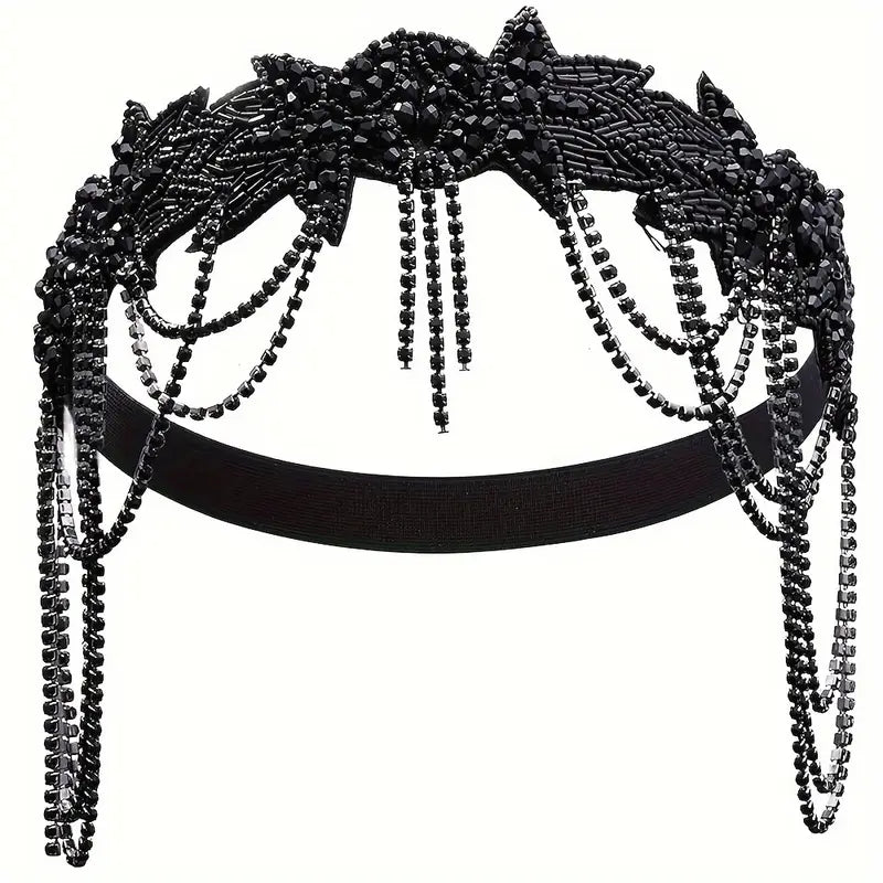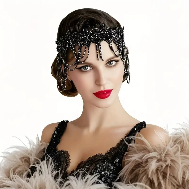Darlings of the Jazz Age knew a secret—the quickest way to a man’s heart was through the sway of a beaded headband catching speakeasy lights. This isn’t mere adornment; it’s liquid onyx dripping down your crown, each jet bead whispering "darling, follow me" with every Charleston turn.