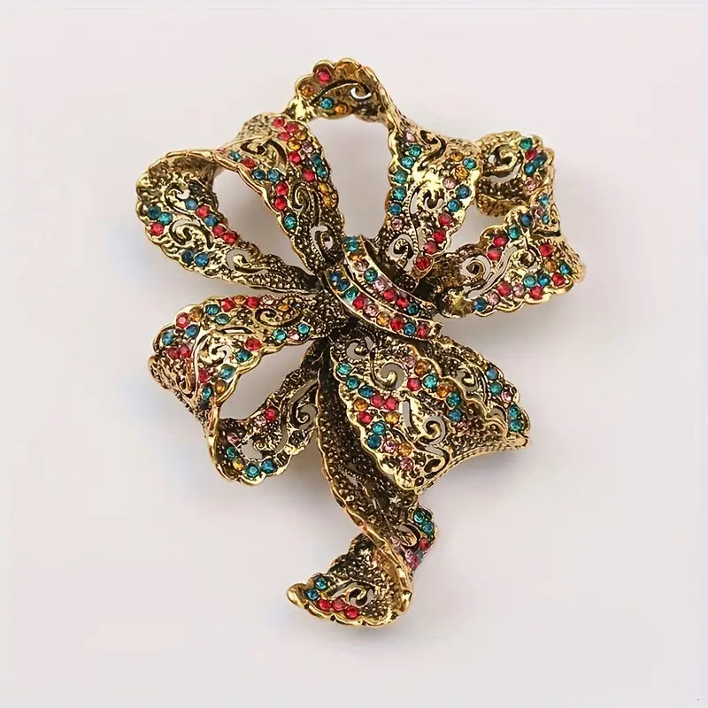 Vintage-Style Lace Bow Brooch with Crystal Embellishments
