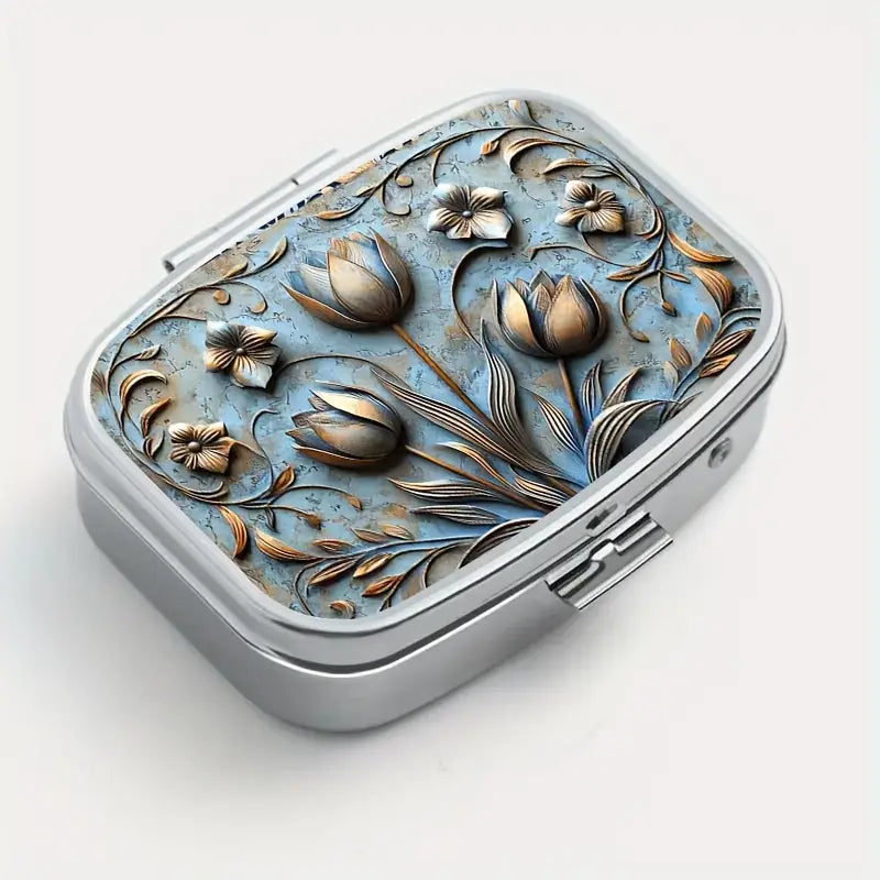 Antique Bronze Floral Square Pill Case – A Timeless Two-Compartment Treasure for the Discerning Traveler"